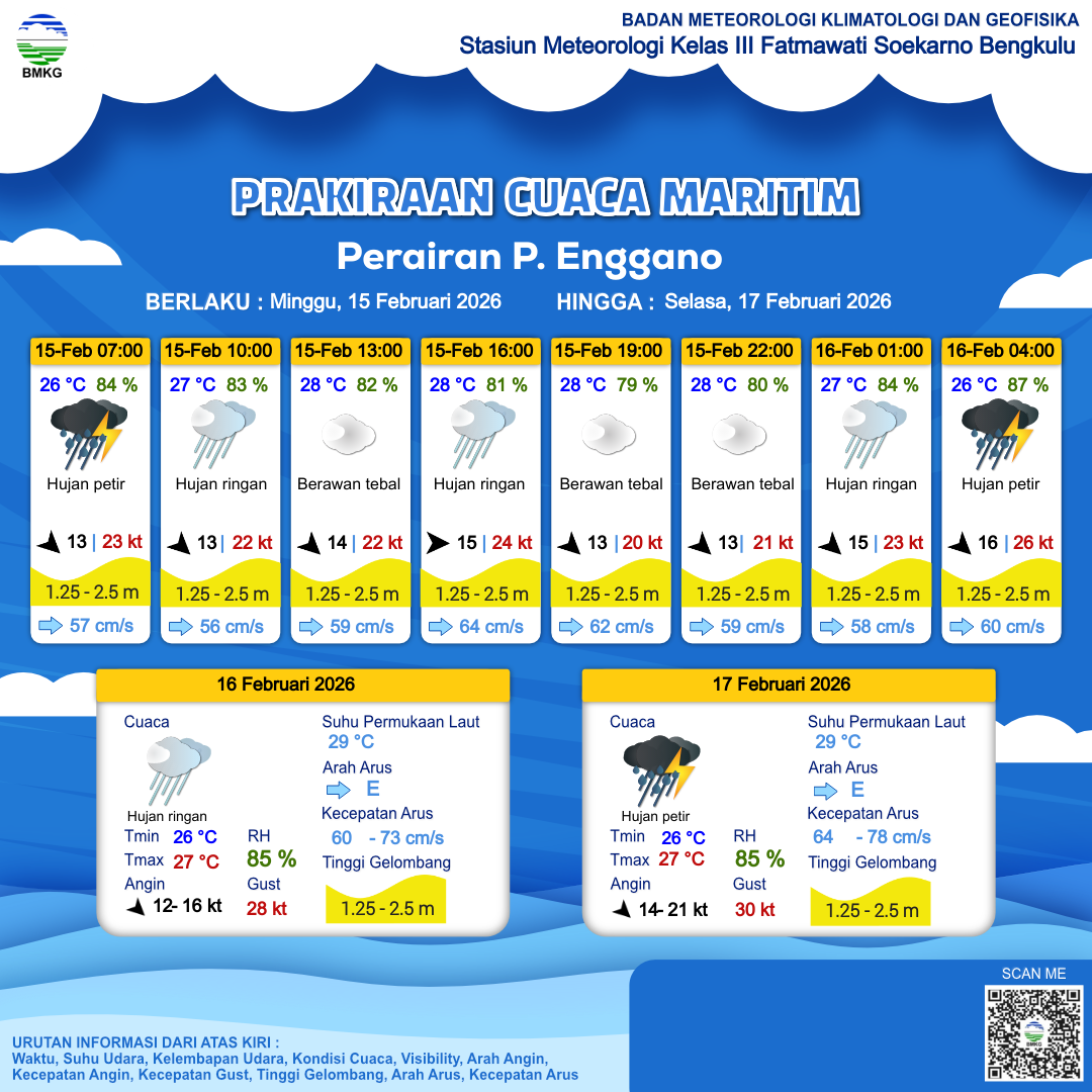 15 Feb 26, 23.00 14 jam kedepan | Barat Laut 12 kt Gust Peningkatan kecepatan angin yang singkat dan tiba-tiba : 25 kt | 2.2 m Sedang | Timur 60.0 cm/s | 27 °C | 84 % |
