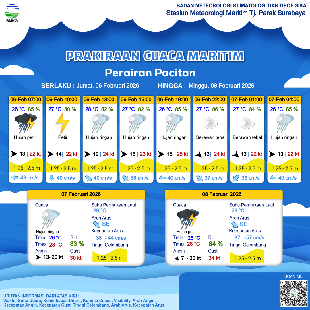 6 Feb 26, 23.00 3 jam kedepan | Hujan Ringan | Barat 13 kt Gust Peningkatan kecepatan angin yang singkat dan tiba-tiba : 23 kt | | | 26 °C | 86 % |