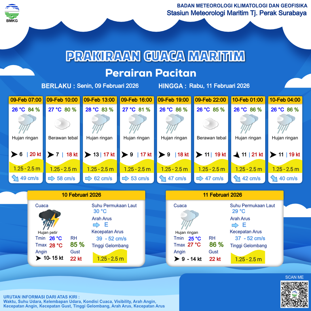 9 Feb 26, 16.00 12 jam kedepan | Barat 11 kt Gust Peningkatan kecepatan angin yang singkat dan tiba-tiba : 20 kt | 2 m Sedang | Timur 45.0 cm/s | 26 °C | 86 % | |