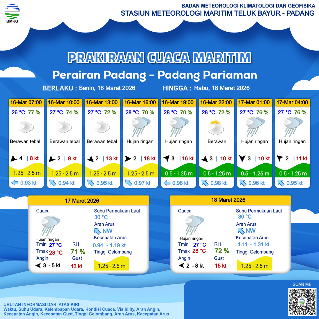 16 Mar 26, 16.00 2 jam kedepan | Barat Laut 3 kt Gust Peningkatan kecepatan angin yang singkat dan tiba-tiba : 10 kt | 1.2 m Rendah | Barat Laut 1.0 knot | 28 °C | 72 % | |