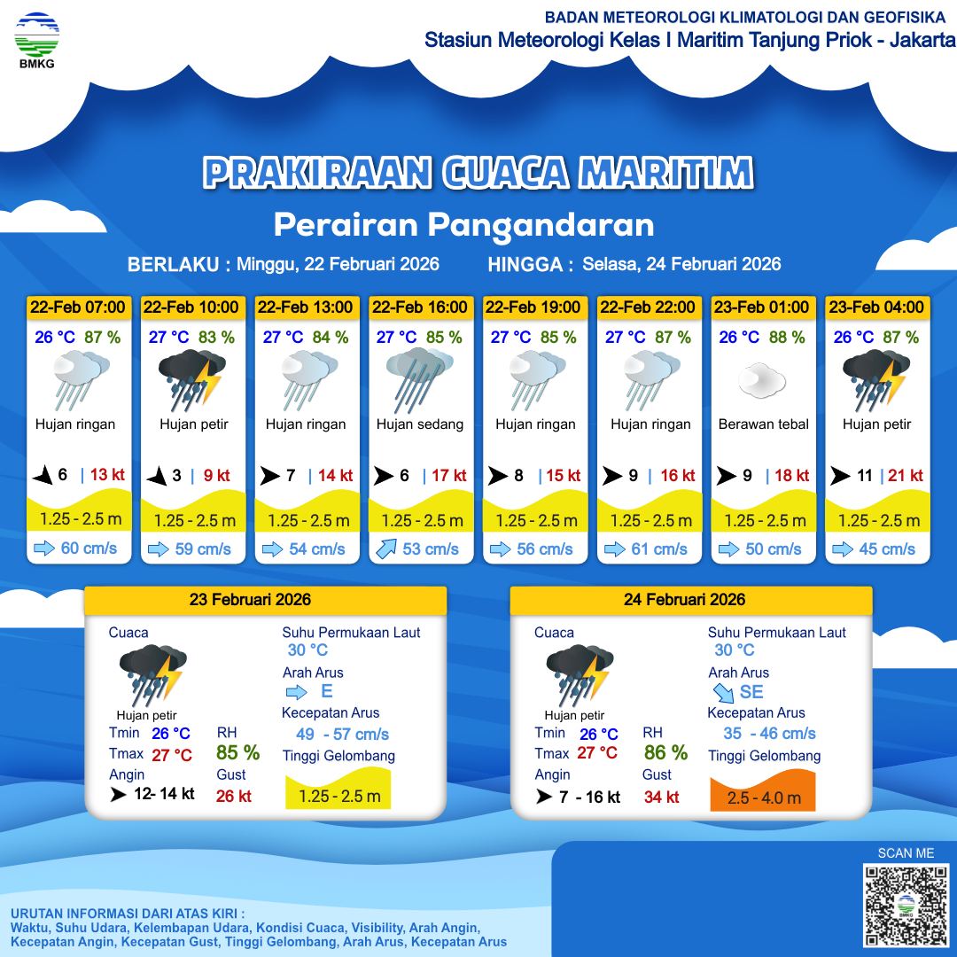 22 Feb 26, 08.00 3 jam kedepan | Barat 6 kt Gust Peningkatan kecepatan angin yang singkat dan tiba-tiba : 17 kt | 1.6 m Sedang | Timur Laut 54.0 cm/s | 27 °C | 86 % | |