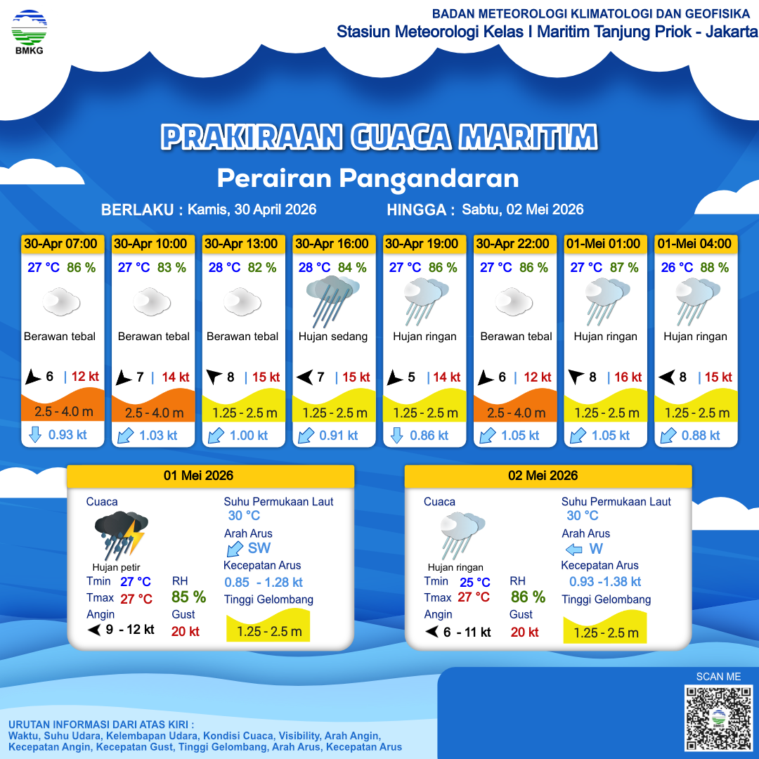 30 Apr 26, 06.00 8 jam kedepan | Tenggara 8 kt Gust Peningkatan kecepatan angin yang singkat dan tiba-tiba : 15 kt | 2.5 m Tinggi | Barat Daya 1.0 Knots | 28 °C | 82 % | |