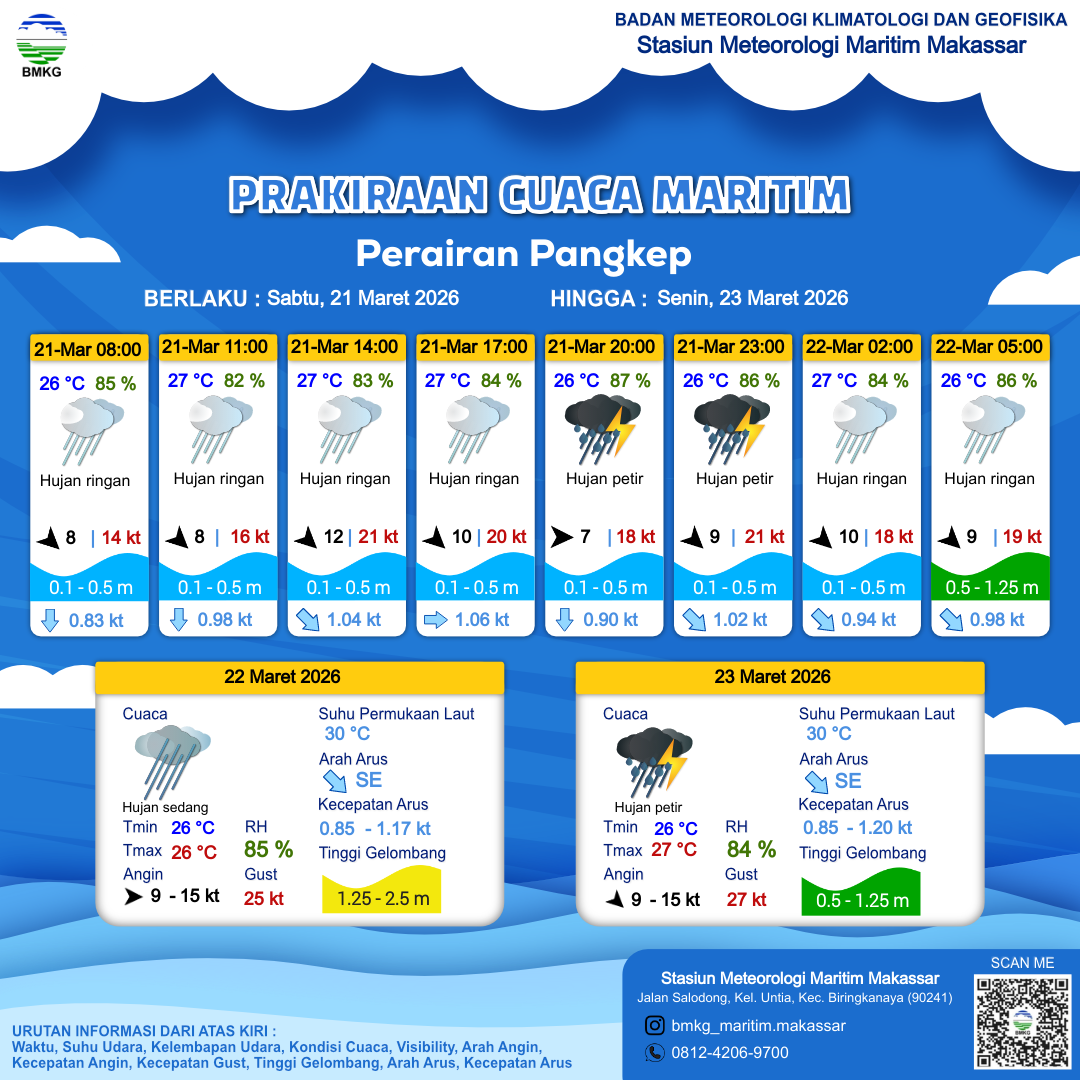 21 Mar 26, 09.00 2 jam kedepan | Barat Laut 10 kt Gust Peningkatan kecepatan angin yang singkat dan tiba-tiba : 20 kt | 0.5 m Rendah | Timur 1.1 Knots | 27 °C | 84 % | |