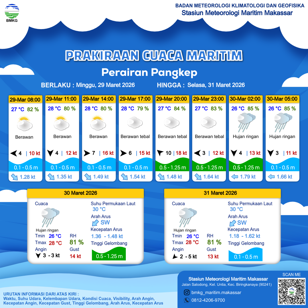 29 Mar 26, 23.00 6 jam kedepan | Timur Laut 3 kt Gust Peningkatan kecepatan angin yang singkat dan tiba-tiba : 8 kt | 0.6 m Rendah | Barat 1.5 Knots | 26 °C | 84 % |