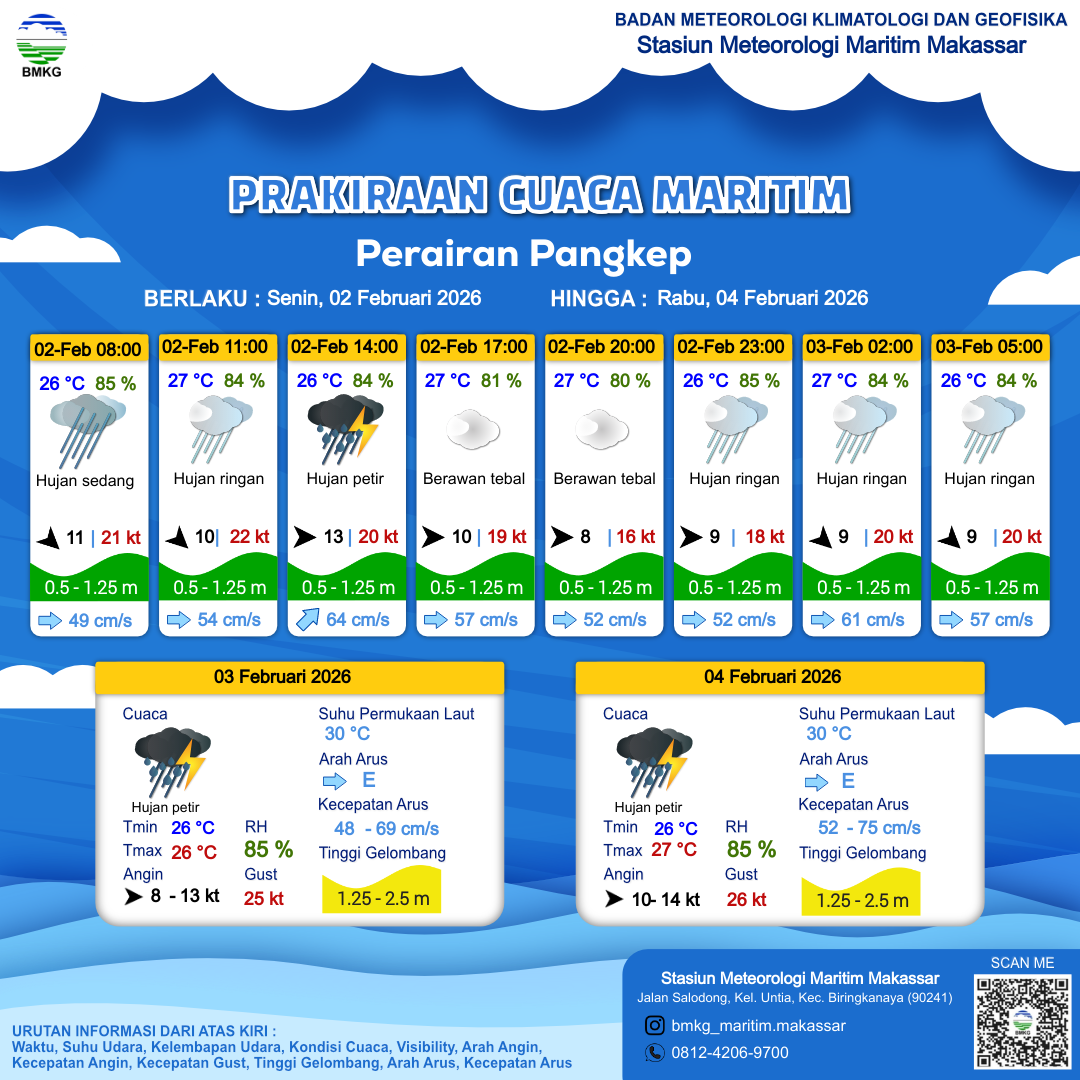 2 Feb 26, 21.00 4 jam kedepan | Barat Laut 9 kt Gust Peningkatan kecepatan angin yang singkat dan tiba-tiba : 20 kt | 0.9 m Rendah | Timur 57.0 cm/s | 26 °C | 84 % | |