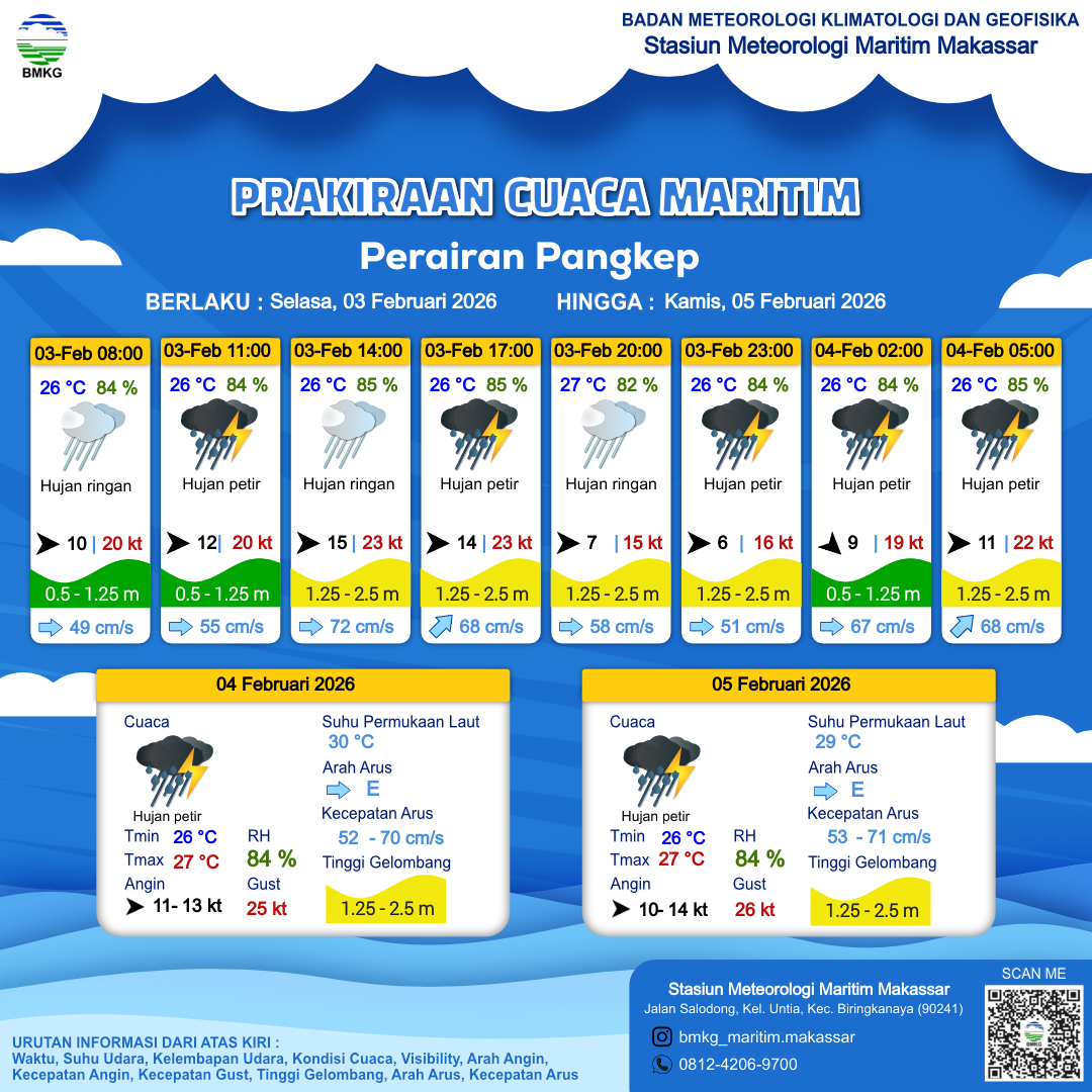 3 Feb 26, 21.00 4 jam kedepan | Barat 11 kt Gust Peningkatan kecepatan angin yang singkat dan tiba-tiba : 22 kt | 1.6 m Sedang | Timur Laut 68.0 cm/s | 26 °C | 85 % | |