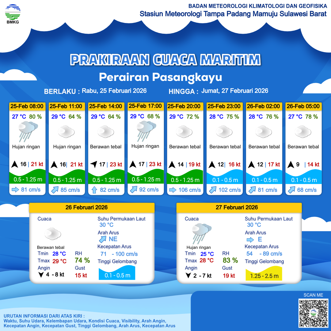 25 Feb 26, 21.00 4 jam kedepan | Berawan Tebal | Utara 6 kt Gust Peningkatan kecepatan angin yang singkat dan tiba-tiba : 14 kt | | | 27 °C | 78 % |
