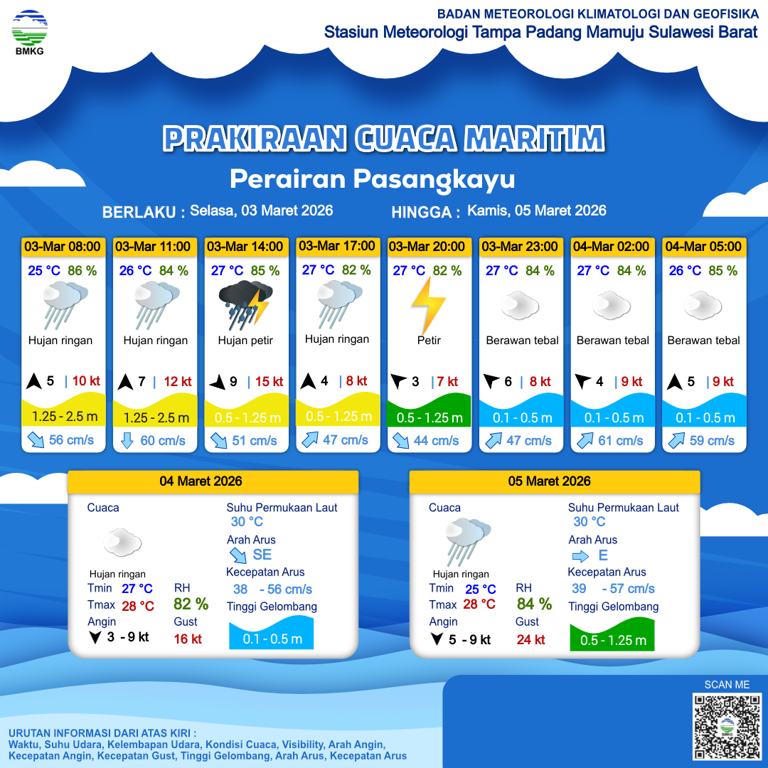3 Mar 26, 07.00 3 jam kedepan | Barat 6 kt Gust Peningkatan kecepatan angin yang singkat dan tiba-tiba : 14 kt | 0.9 m Rendah | Timur 50.0 cm/s | 27 °C | 84 % | |