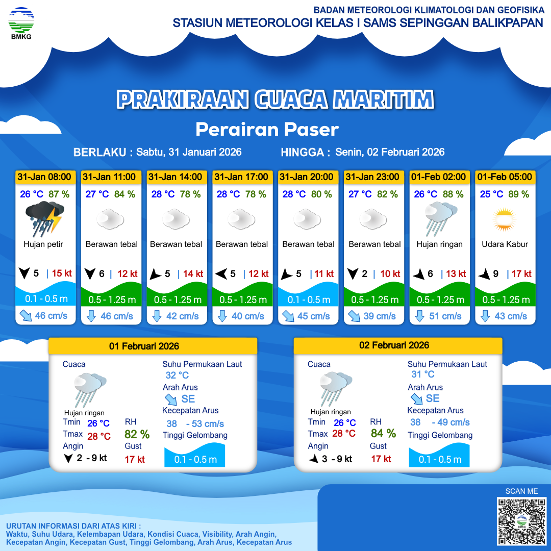 31 Jan 26, 23.00 4 jam kedepan | Berawan Tebal | Utara 9 kt Gust Peningkatan kecepatan angin yang singkat dan tiba-tiba : 17 kt | | | 26 °C | 87 % |