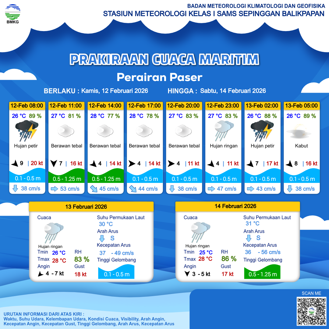 12 Feb 26, 04.00 4 jam kedepan | Utara 7 kt Gust Peningkatan kecepatan angin yang singkat dan tiba-tiba : 16 kt | 0.9 m Rendah | Timur 53.0 cm/s | 27 °C | 80 % | |