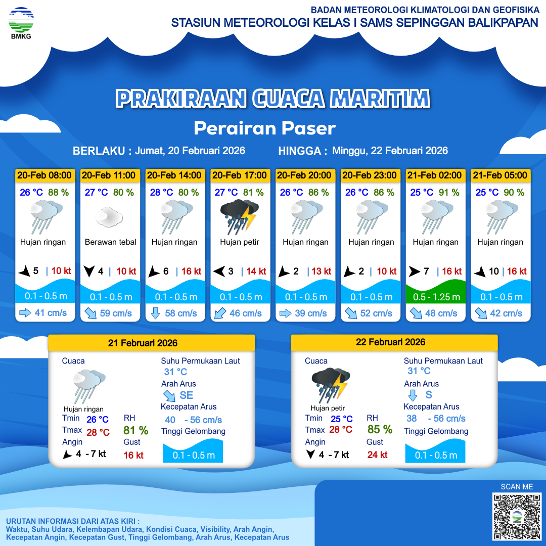 20 Feb 26, 21.00 4 jam kedepan | Hujan Ringan | Barat Laut 10 kt Gust Peningkatan kecepatan angin yang singkat dan tiba-tiba : 16 kt | | | 25 °C | 90 % |