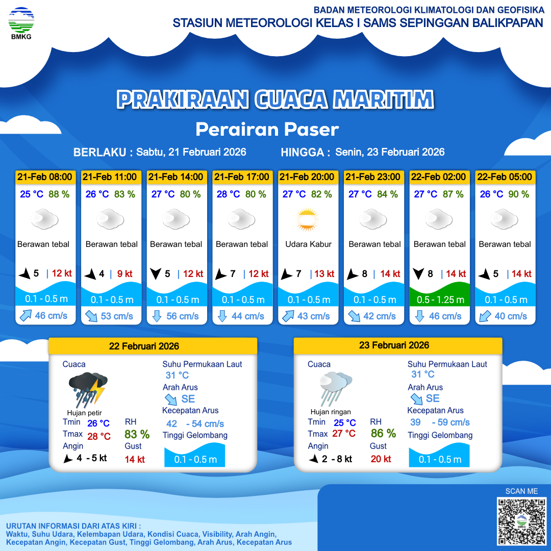 21 Feb 26, 22.00 4 jam kedepan | Berawan Tebal | Barat Laut 5 kt Gust Peningkatan kecepatan angin yang singkat dan tiba-tiba : 11 kt | | | 26 °C | 90 % |
