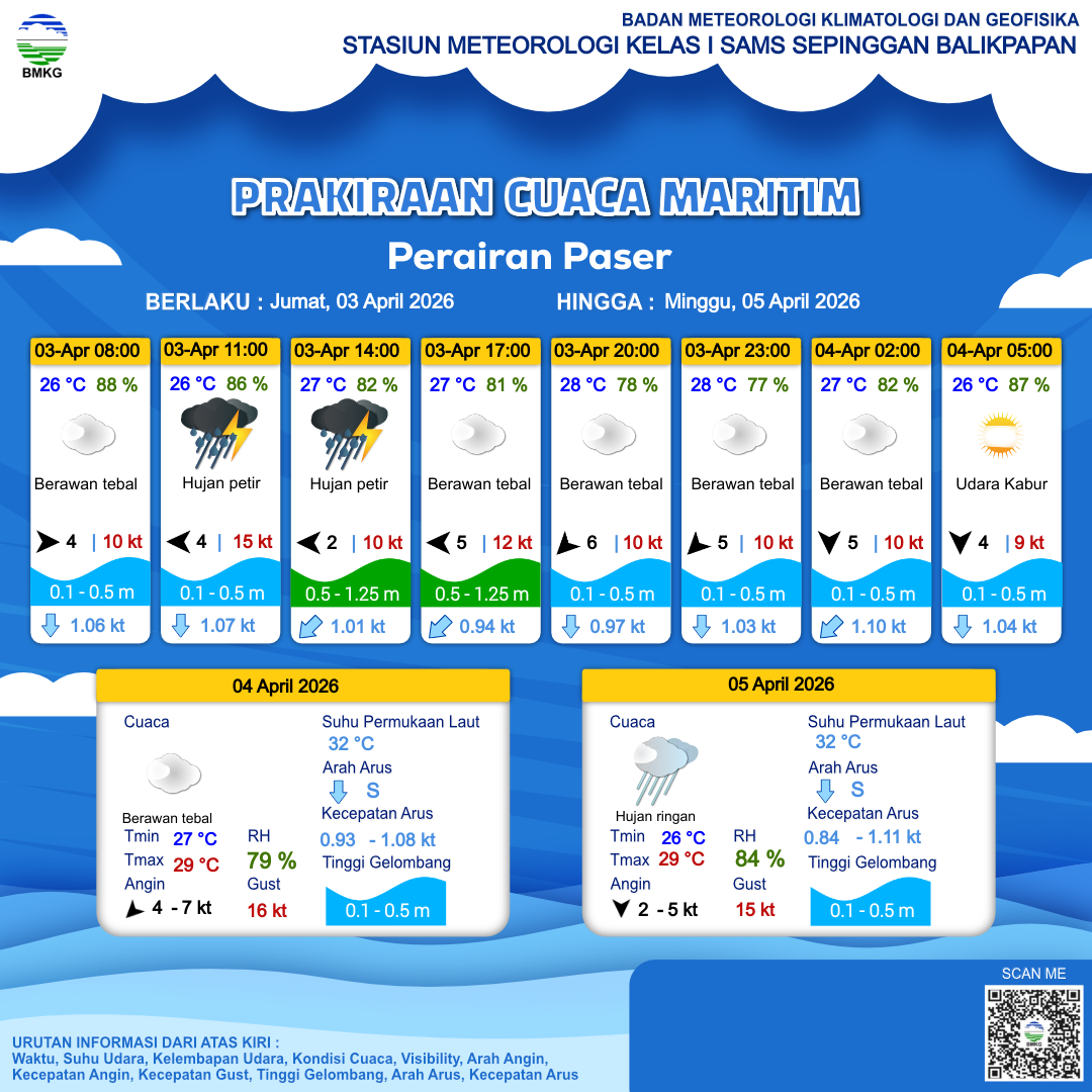 3 Apr 26, 08.00 4 jam kedepan | Timur 5 kt Gust Peningkatan kecepatan angin yang singkat dan tiba-tiba : 11 kt | 0.7 m Rendah | Barat Daya 0.9 Knots | 27 °C | 81 % | |