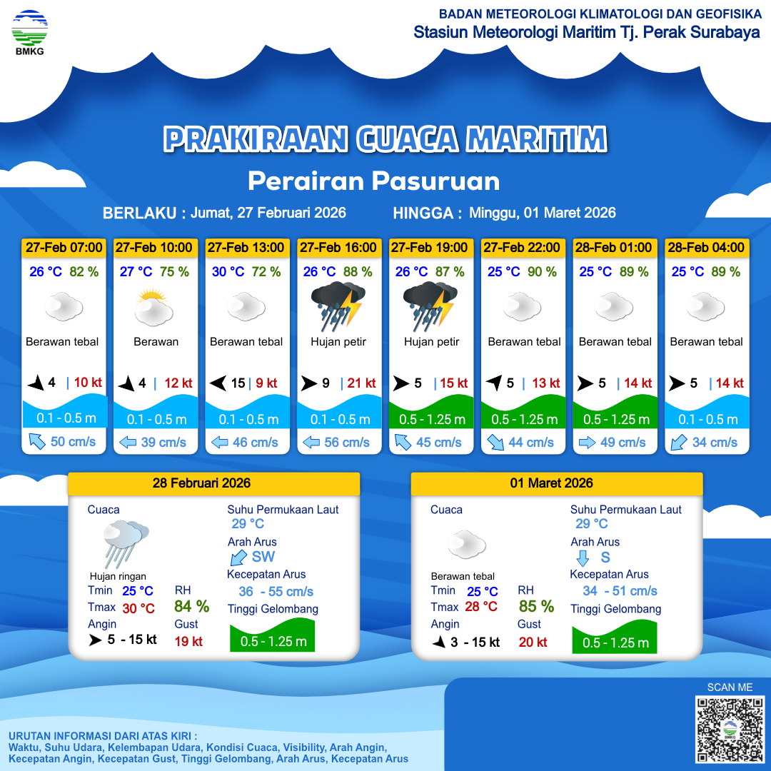 27 Feb 26, 23.00 3 jam kedepan | Berawan Tebal | Barat 5 kt Gust Peningkatan kecepatan angin yang singkat dan tiba-tiba : 11 kt | | | 25 °C | 88 % |
