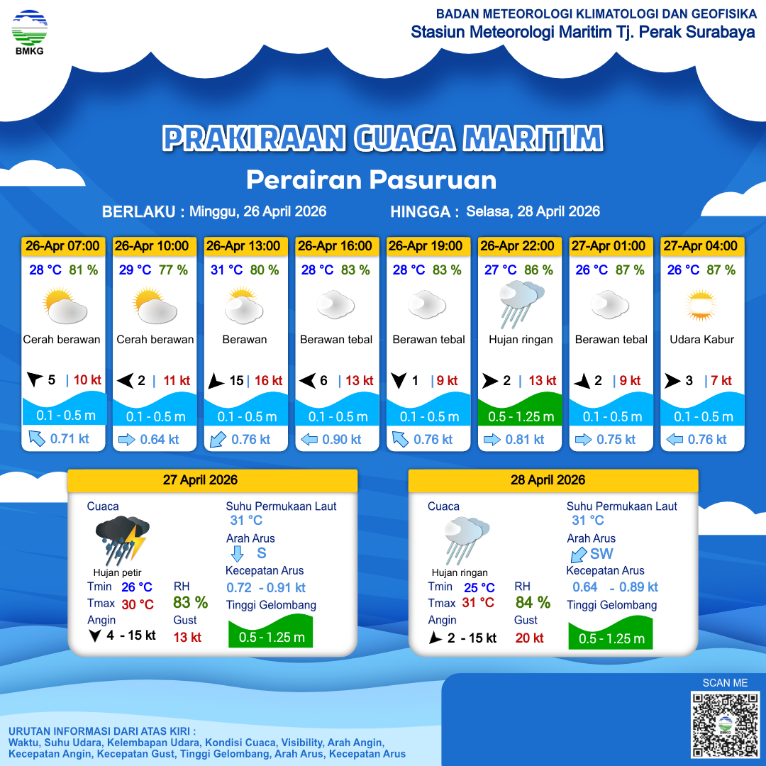 25 Apr 26, 12.00 2 jam kedepan | Timur 11 kt Gust Peningkatan kecepatan angin yang singkat dan tiba-tiba : 17 kt | 0.6 m Rendah | Barat 0.7 Knots | 28 °C | 83 % | |