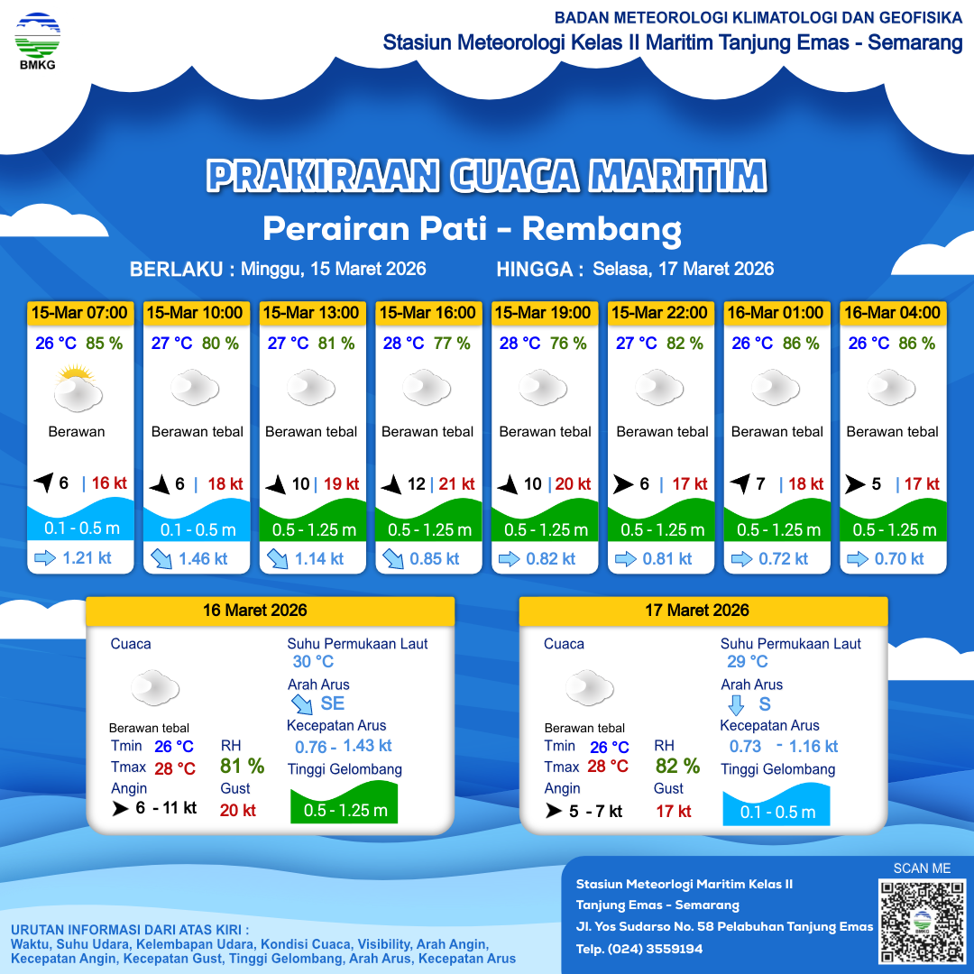15 Mar 26, 09.00 4 jam kedepan | Barat Laut 12 kt Gust Peningkatan kecepatan angin yang singkat dan tiba-tiba : 21 kt | 0.9 m Rendah | Tenggara 0.8 cm/s | 28 °C | 77 % | |