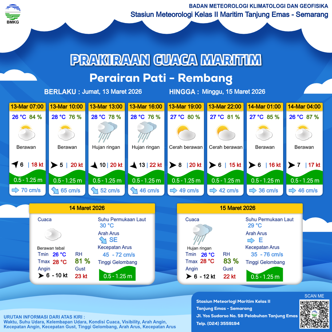 12 Mar 26, 23.00 2 jam kedepan | Hujan Ringan | Barat 6 kt Gust Peningkatan kecepatan angin yang singkat dan tiba-tiba : 17 kt | | | 26 °C | 88 % |