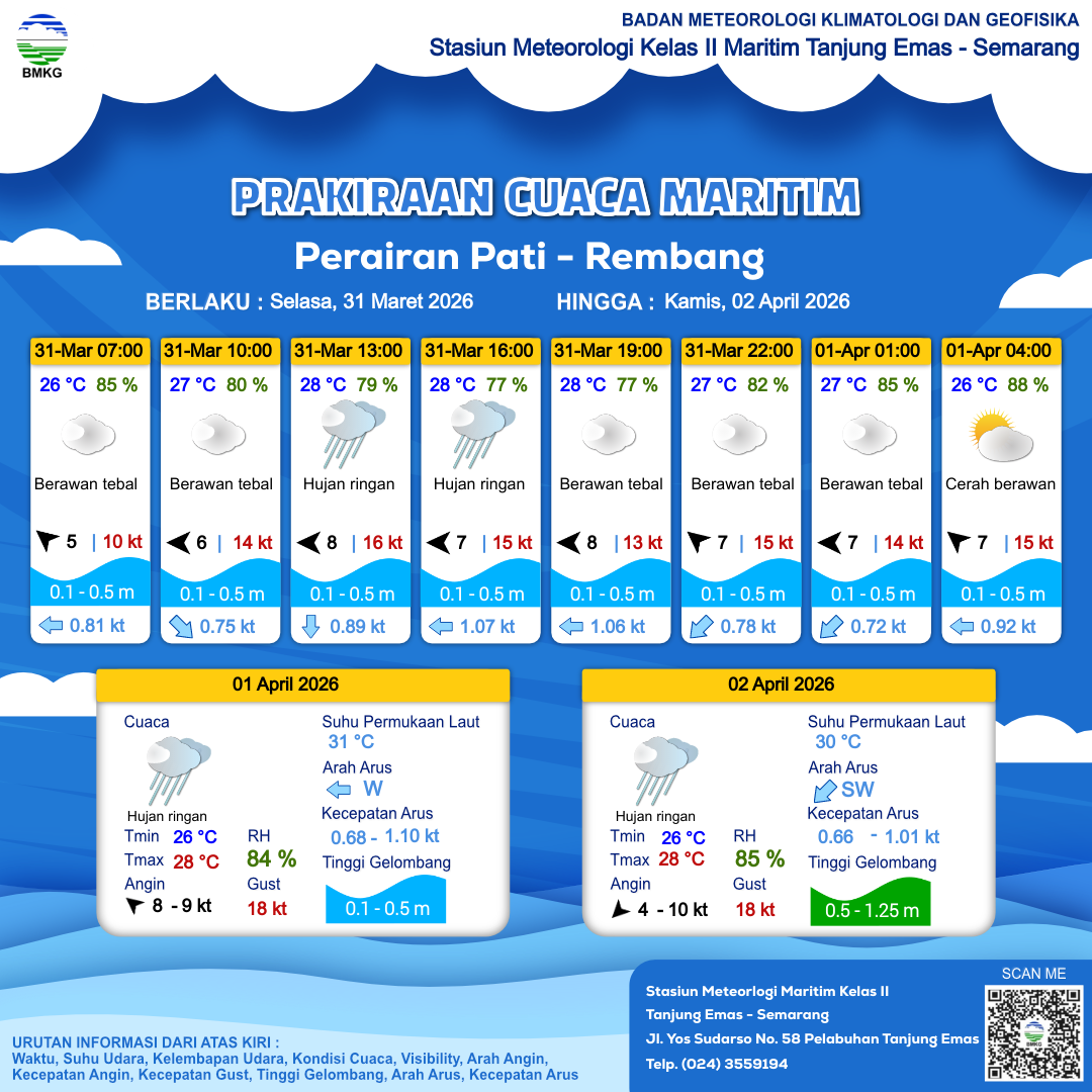 31 Mar 26, 19.00 3 jam kedepan | Timur 7 kt Gust Peningkatan kecepatan angin yang singkat dan tiba-tiba : 14 kt | 0.4 m Tenang | Barat 0.8 Knots | 26 °C | 87 % | |