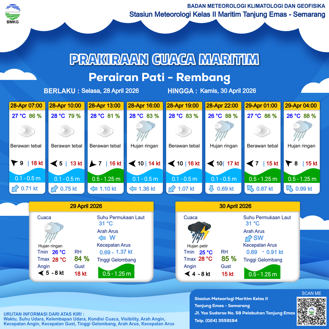 27 Apr 26, 03.00 4 jam kedepan | Timur 4 kt Gust Peningkatan kecepatan angin yang singkat dan tiba-tiba : 12 kt | 0.4 m Tenang | Timur 0.9 Knots | 28 °C | 78 % | |