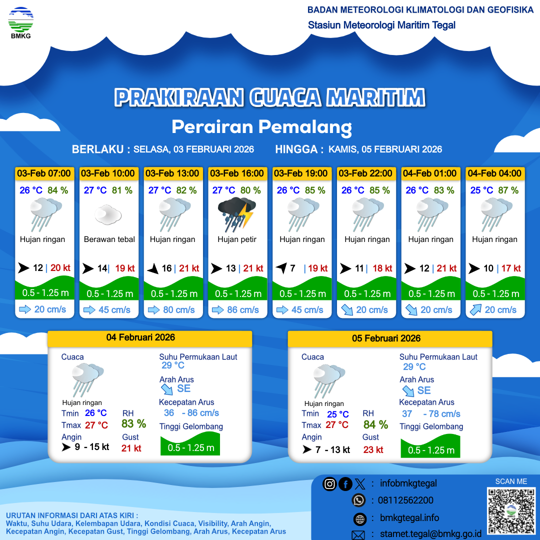 3 Feb 26, 09.00 2 jam kedepan | Barat 13 kt Gust Peningkatan kecepatan angin yang singkat dan tiba-tiba : 21 kt | 1.1 m Rendah | Timur 86.0 cm/s | 27 °C | 80 % | |