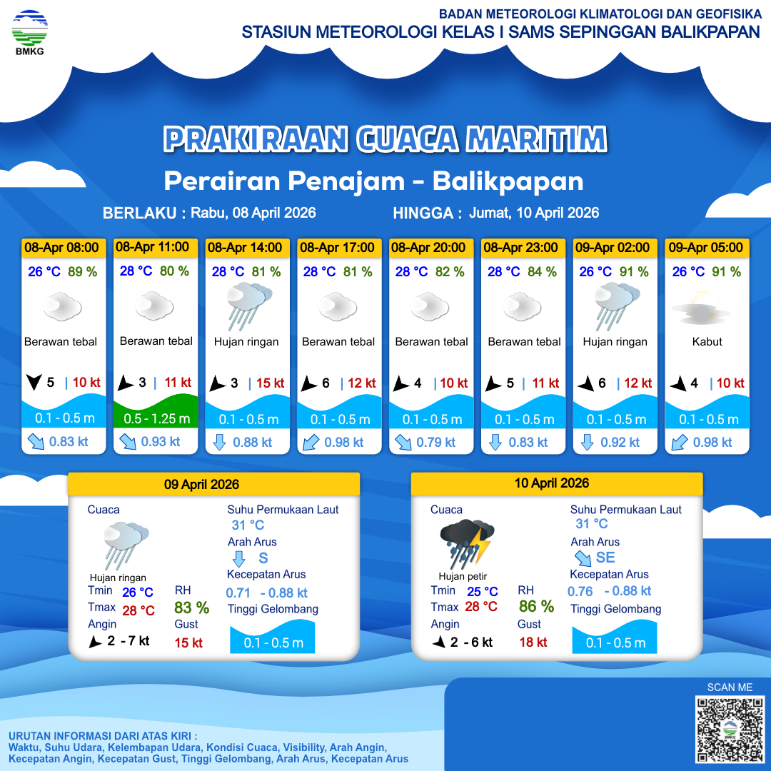 8 Apr 26, 13.00 3 jam kedepan | Timur Laut 4 kt Gust Peningkatan kecepatan angin yang singkat dan tiba-tiba : 10 kt | 0.4 m Tenang | Selatan 0.8 Knots | 28 °C | 83 % | |