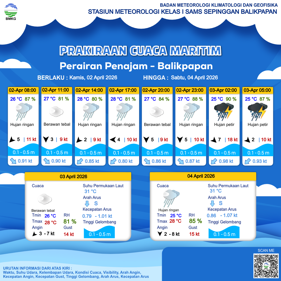 2 Apr 26, 08.00 6 jam kedepan | Timur 4 kt Gust Peningkatan kecepatan angin yang singkat dan tiba-tiba : 12 kt | 0.4 m Tenang | Barat Daya 0.8 Knots | 28 °C | 81 % | |