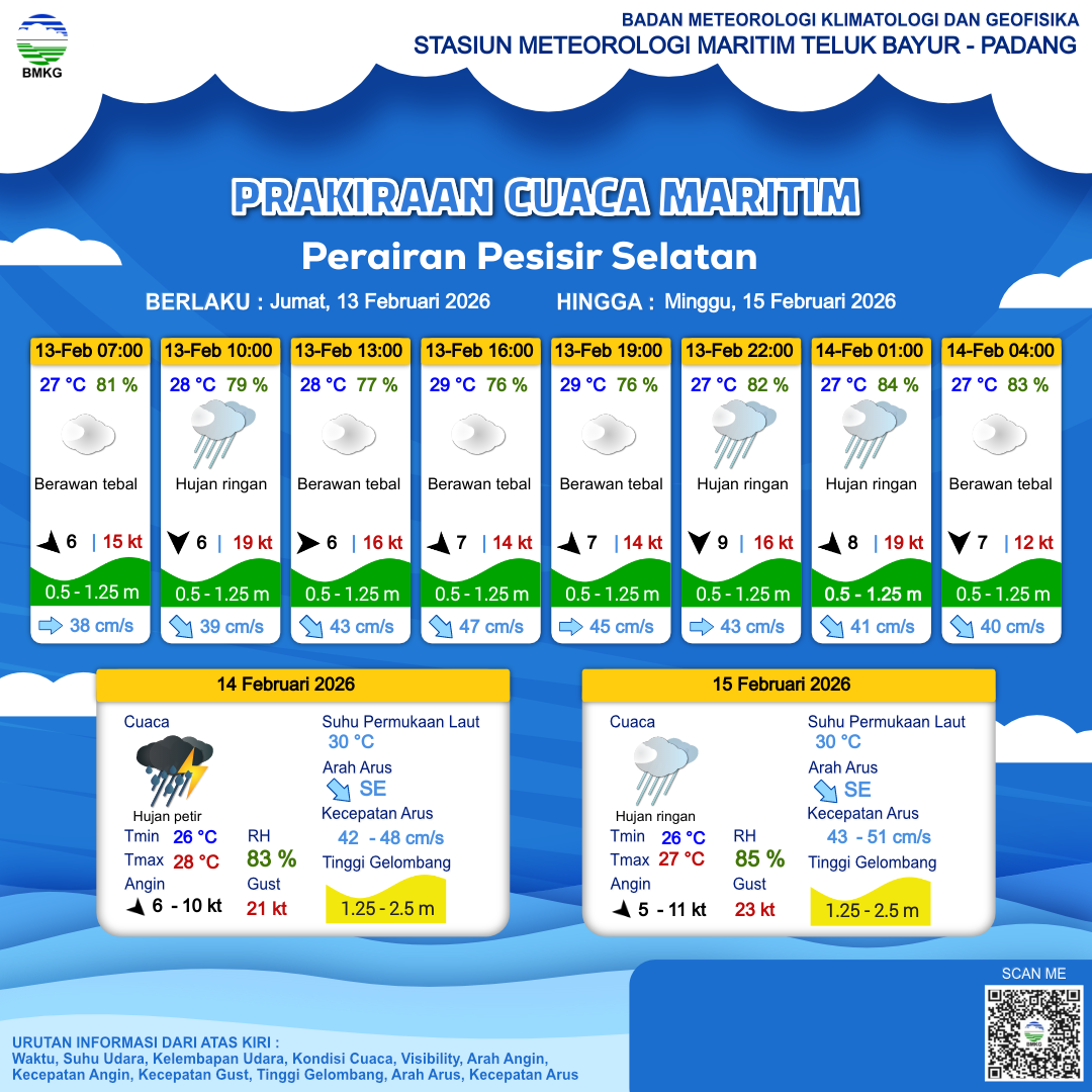 13 Feb 26, 05.00 3 jam kedepan | Barat 6 kt Gust Peningkatan kecepatan angin yang singkat dan tiba-tiba : 17 kt | 1.1 m Rendah | Tenggara 41.0 cm/s | 28 °C | 77 % | |