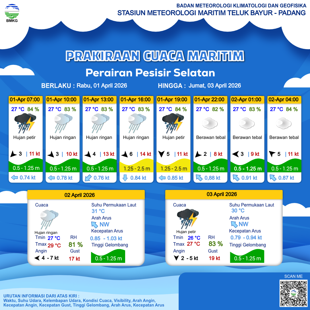 1 Apr 26, 05.00 4 jam kedepan | Barat Laut 4 kt Gust Peningkatan kecepatan angin yang singkat dan tiba-tiba : 13 kt | 1.1 m Rendah | Barat 0.8 Knots | 27 °C | 83 % | |