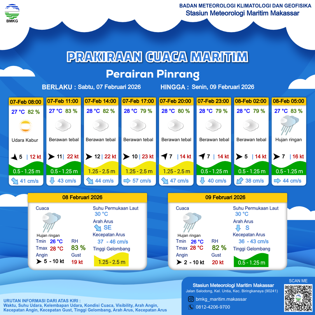7 Feb 26, 19.00 8 jam kedepan | Barat 5 kt Gust Peningkatan kecepatan angin yang singkat dan tiba-tiba : 12 kt | 0.9 m Rendah | Selatan 40.0 cm/s | 28 °C | 80 % | |