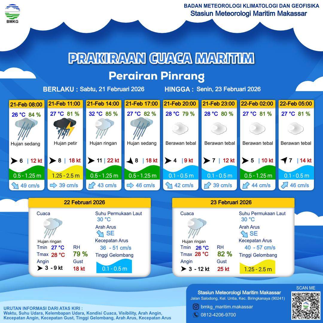 21 Feb 26, 21.00 3 jam kedepan | Barat Daya 7 kt Gust Peningkatan kecepatan angin yang singkat dan tiba-tiba : 14 kt | 0.5 m Rendah | Timur Laut 46.0 cm/s | 27 °C | 81 % | |