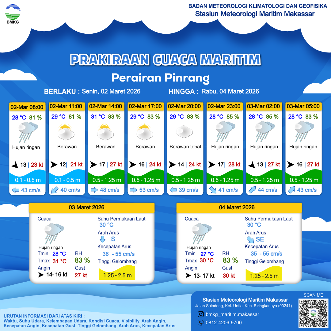 2 Mar 26, 06.00 4 jam kedepan | Barat 17 kt Gust Peningkatan kecepatan angin yang singkat dan tiba-tiba : 27 kt | 0.9 m Rendah | Timur 48.0 cm/s | 31 °C | 83 % | |