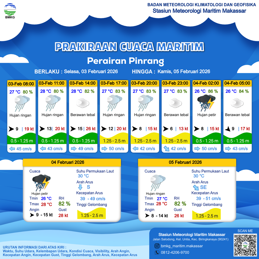 3 Feb 26, 08.00 3 jam kedepan | Barat 12 kt Gust Peningkatan kecepatan angin yang singkat dan tiba-tiba : 25 kt | 1.3 m Sedang | Timur 53.0 cm/s | 27 °C | 83 % | |