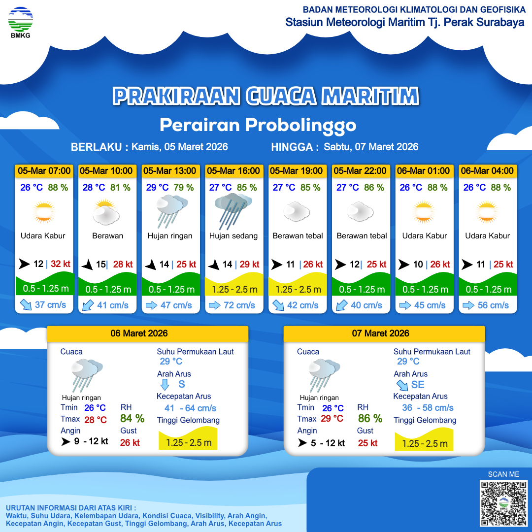 4 Mar 26, 23.00 2 jam kedepan | Berawan Tebal | Barat 12 kt Gust Peningkatan kecepatan angin yang singkat dan tiba-tiba : 28 kt | | | 26 °C | 88 % |