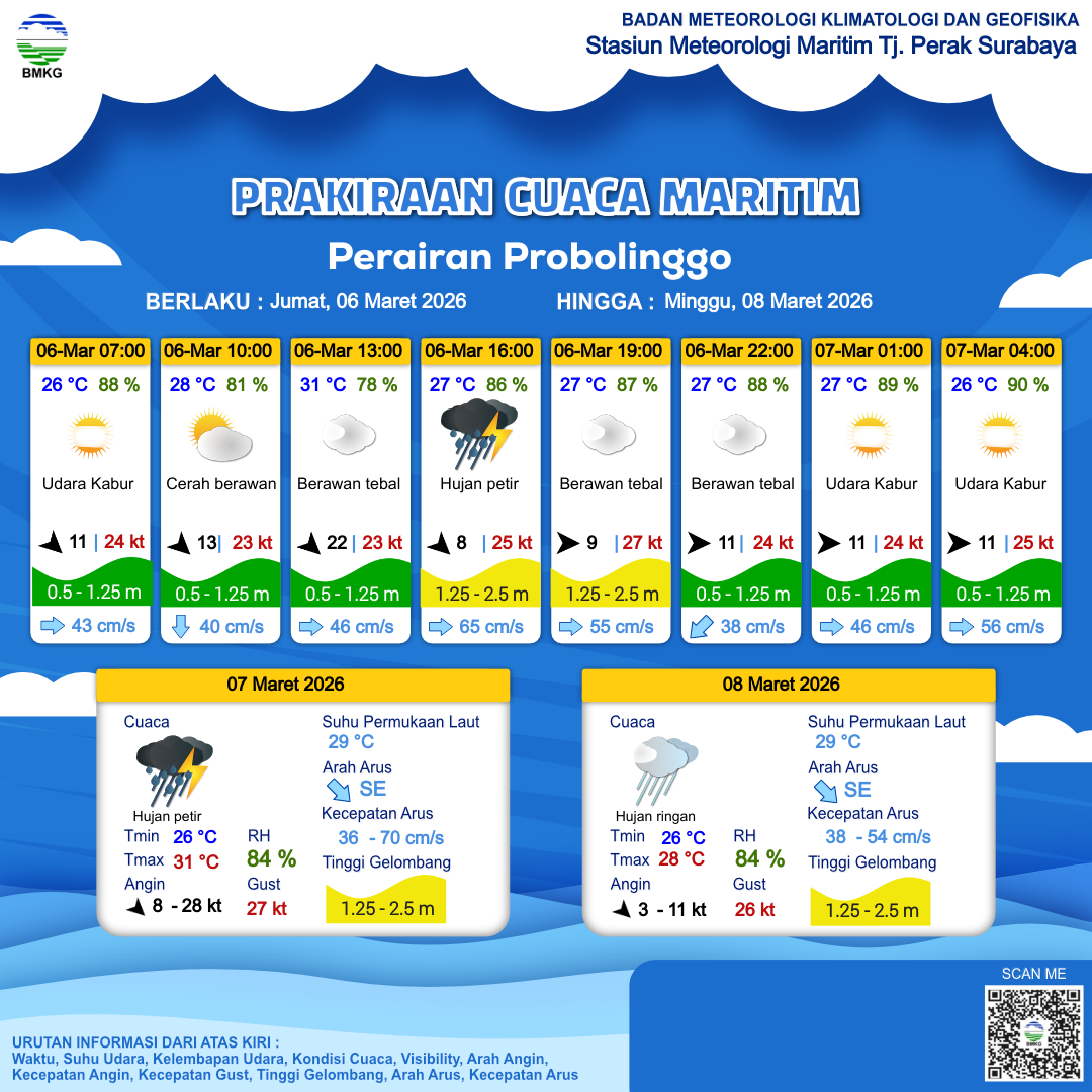 5 Mar 26, 23.00 2 jam kedepan | Hujan Ringan | Barat 9 kt Gust Peningkatan kecepatan angin yang singkat dan tiba-tiba : 25 kt | | | 26 °C | 88 % |
