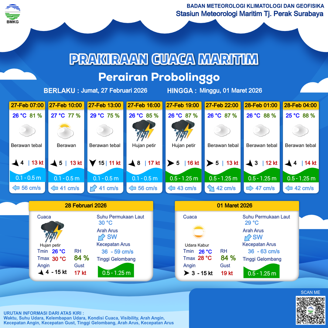 27 Feb 26, 08.00 12 jam yang lalu | Hujan Petir | Barat Laut 8 kt Gust Peningkatan kecepatan angin yang singkat dan tiba-tiba : 12 kt | | | 28 °C | 78 % |