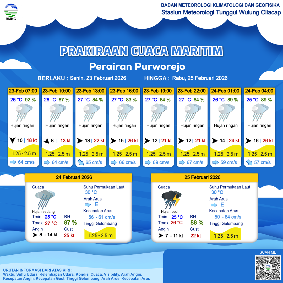 23 Feb 26, 22.00 22 jam kedepan | Barat 16 kt Gust Peningkatan kecepatan angin yang singkat dan tiba-tiba : 27 kt | 2.1 m Sedang | Tenggara 57.0 cm/s | 25 °C | 89 % | |