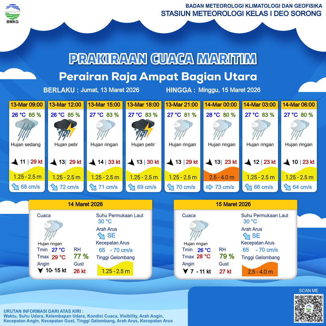 12 Mar 26, 22.00 3 jam kedepan | Hujan Petir | Barat Laut 13 kt Gust Peningkatan kecepatan angin yang singkat dan tiba-tiba : 25 kt | | | 27 °C | 82 % |