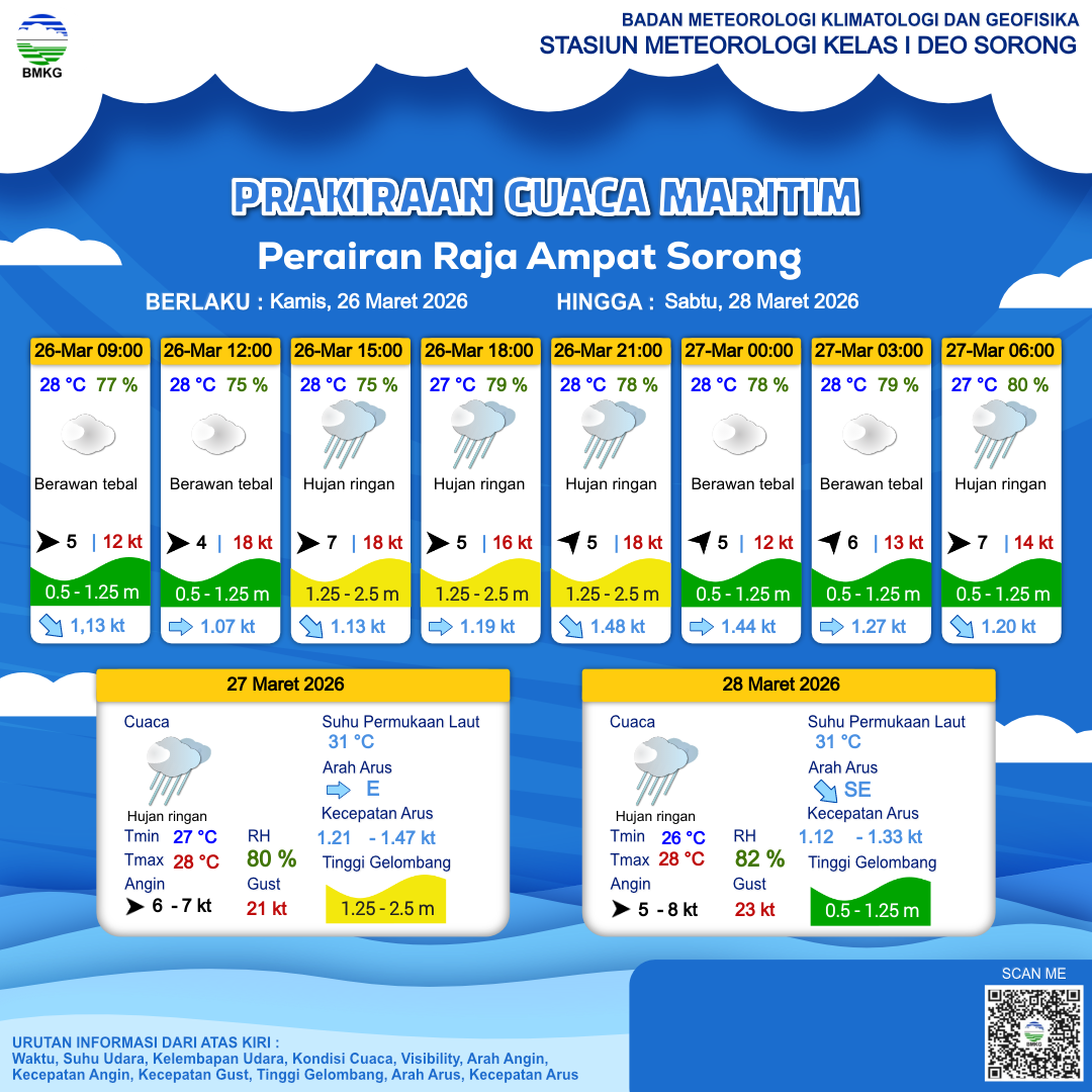 26 Mar 26, 20.00 3 jam kedepan | Barat 7 kt Gust Peningkatan kecepatan angin yang singkat dan tiba-tiba : 15 kt | 1.2 m Rendah | Timur 1.2 Knots | 27 °C | 79 % | |