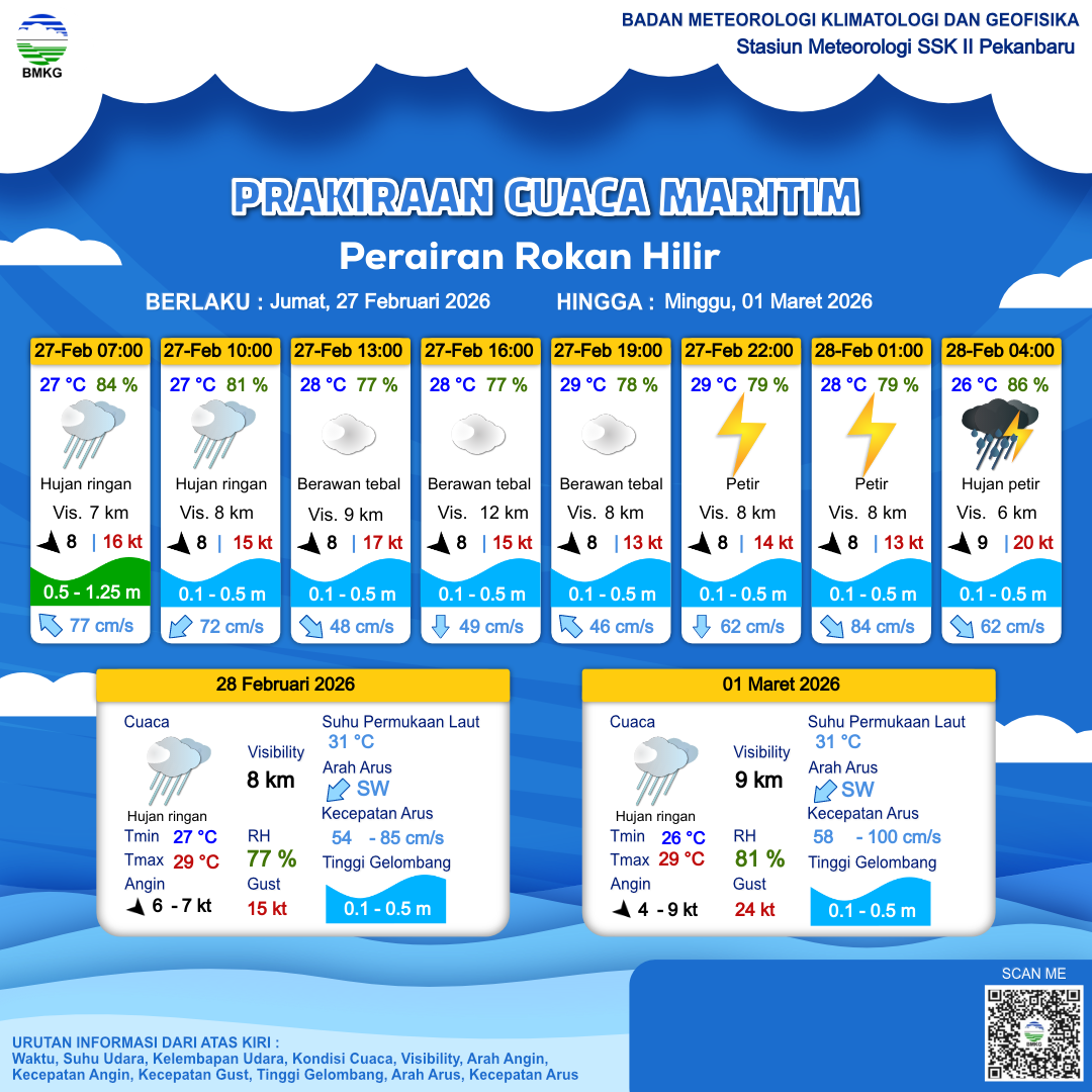 27 Feb 26, 23.00 3 jam kedepan | Hujan Ringan | Barat Laut 7 kt Gust Peningkatan kecepatan angin yang singkat dan tiba-tiba : 16 kt | | | 27 °C | 82 % |