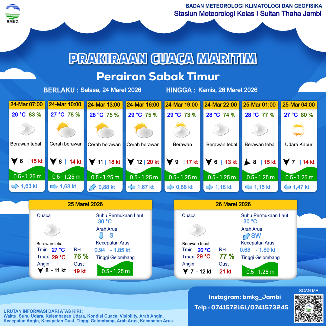 24 Mar 26, 23.00 15 jam kedepan | Utara 8 kt Gust Peningkatan kecepatan angin yang singkat dan tiba-tiba : 12 kt | 0.9 m Rendah | Tenggara 0.8 Knots | 26 °C | 83 % |