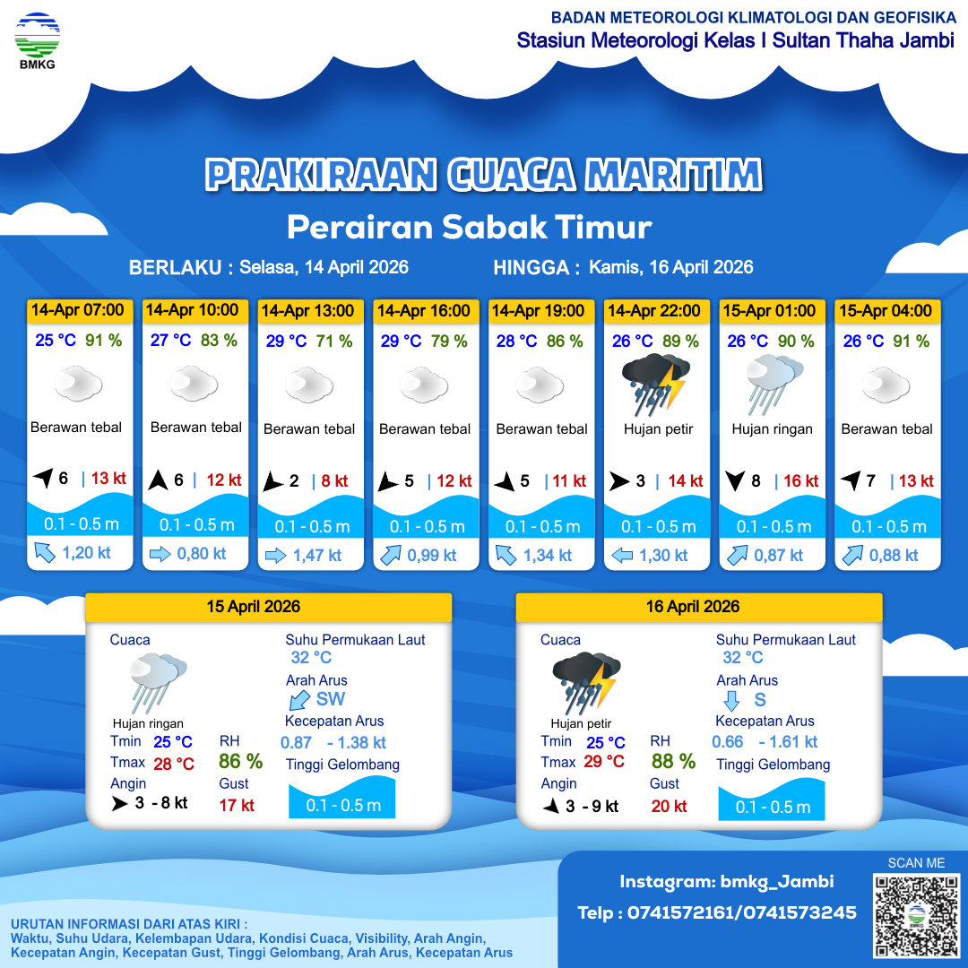 14 Apr 26, 22.00 14 jam kedepan | Barat Daya 7 kt Gust Peningkatan kecepatan angin yang singkat dan tiba-tiba : 14 kt | 0.3 m Tenang | Timur Laut 0.9 Knots | 26 °C | 92 % | |
