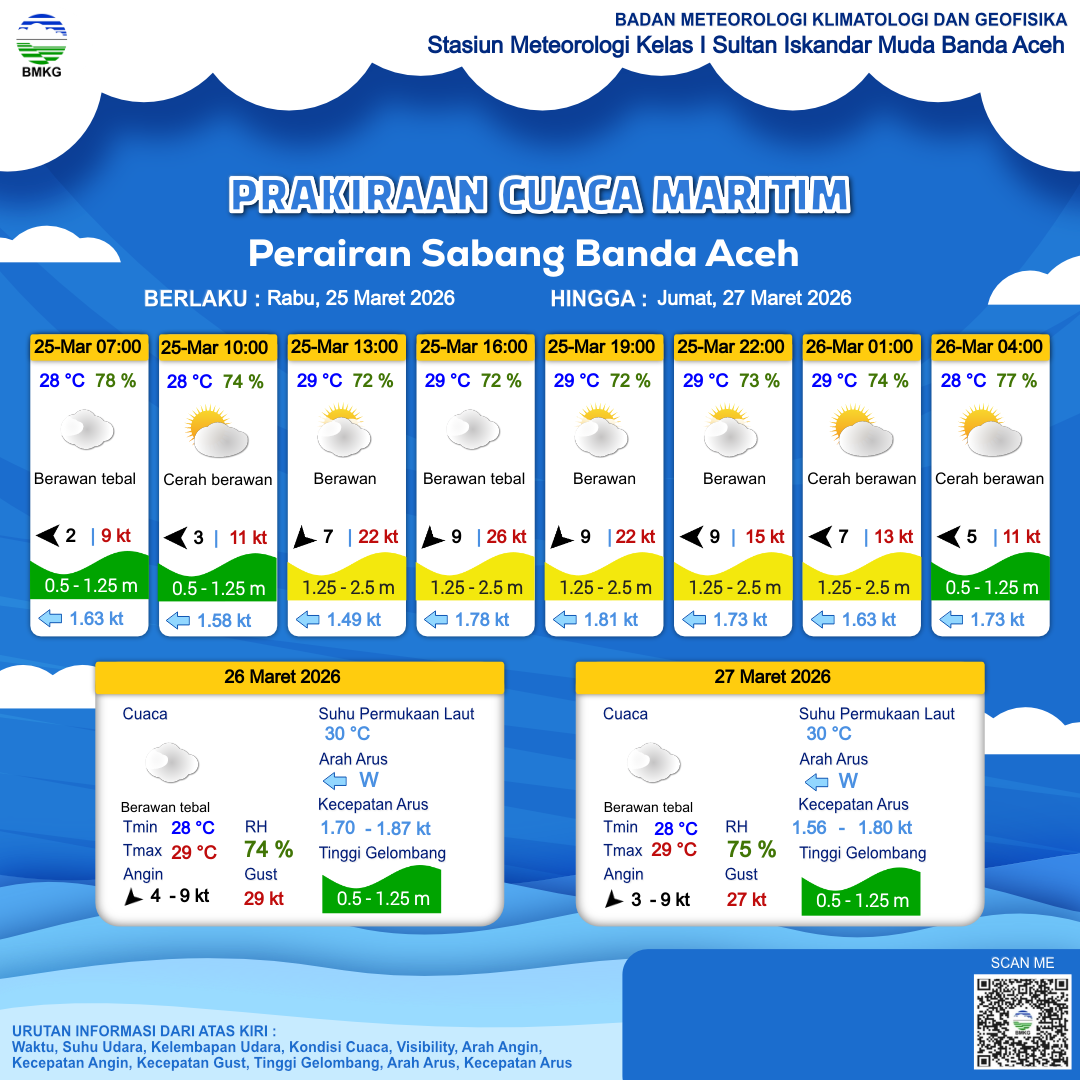 25 Mar 26, 23.00 2 jam kedepan | Cerah Berawan | Timur 4 kt Gust Peningkatan kecepatan angin yang singkat dan tiba-tiba : 9 kt | | | 28 °C | 78 % |