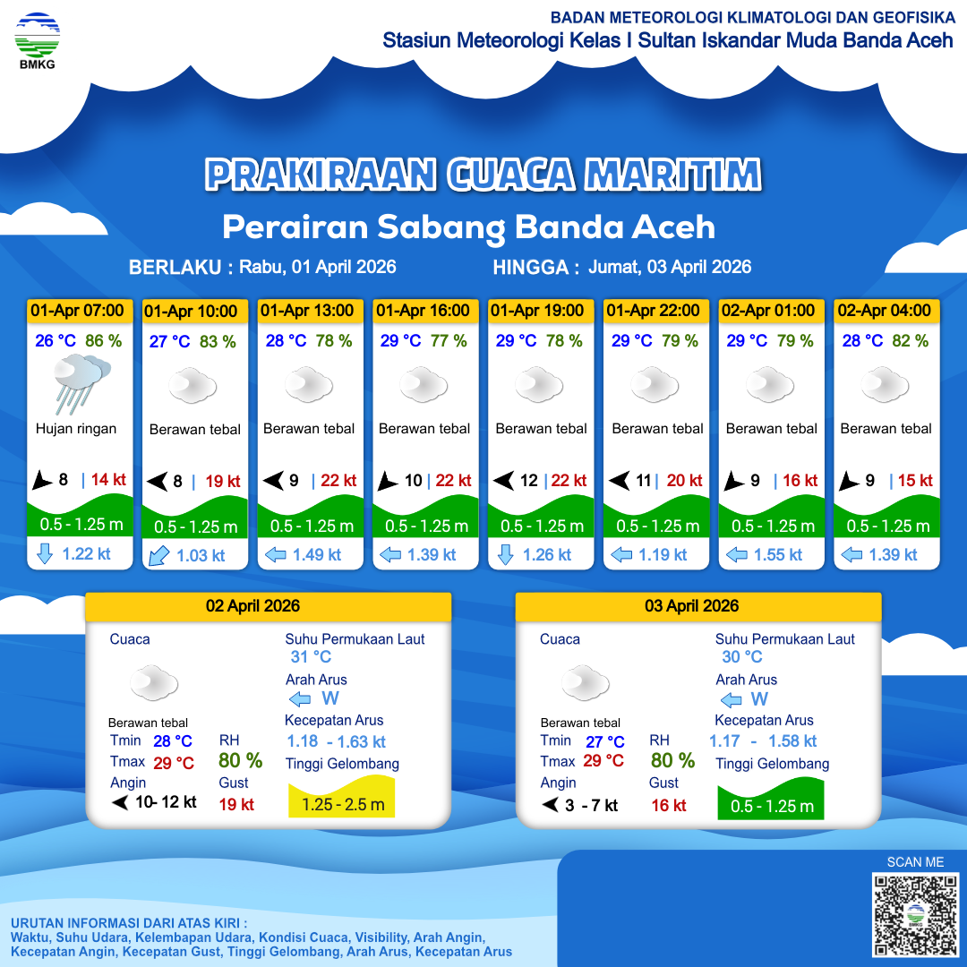 1 Apr 26, 20.00 12 jam kedepan | Timur Laut 9 kt Gust Peningkatan kecepatan angin yang singkat dan tiba-tiba : 14 kt | 1.1 m Rendah | Barat 1.5 Knots | 28 °C | 82 % | |