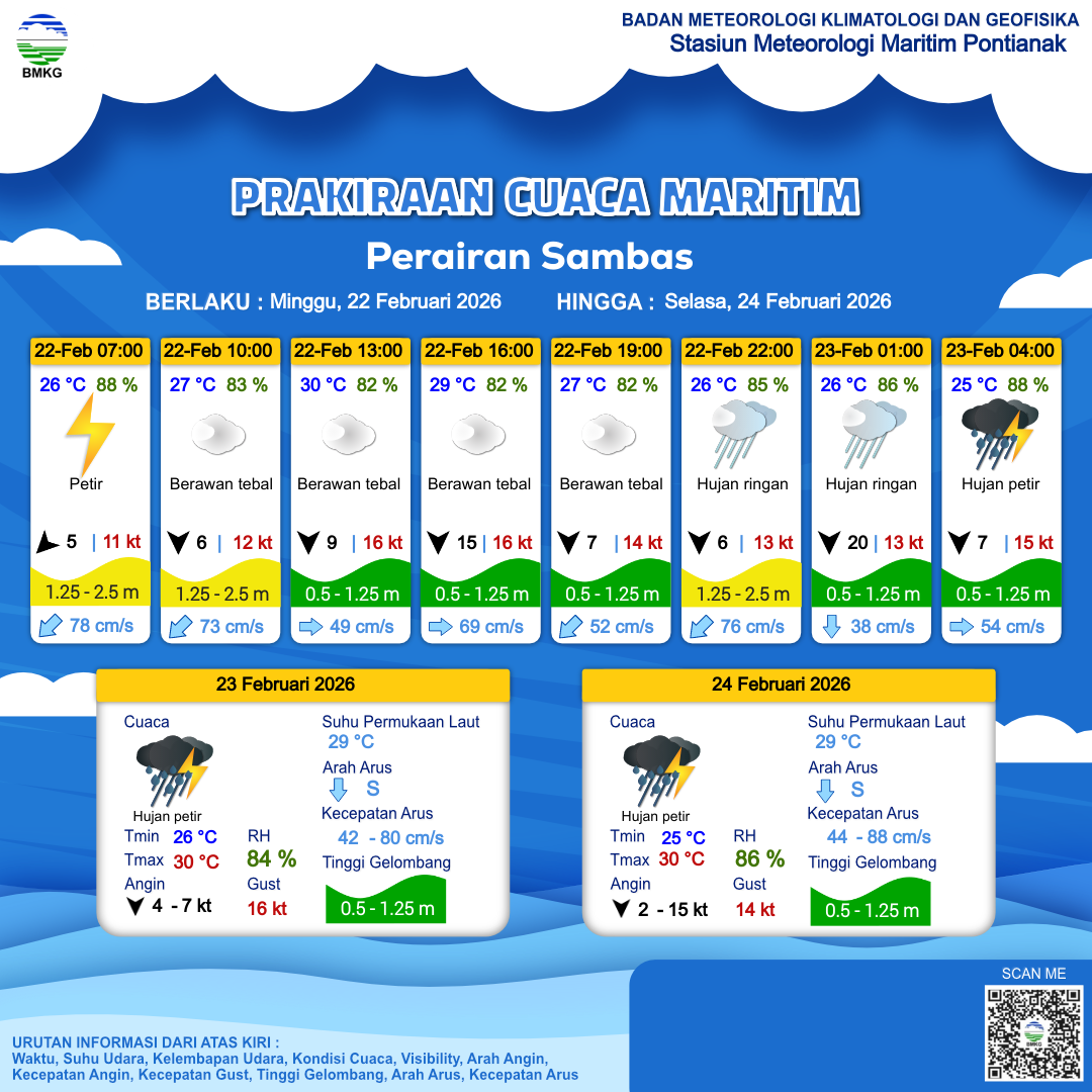 22 Feb 26, 07.00 6 jam kedepan | Utara 20 kt Gust Peningkatan kecepatan angin yang singkat dan tiba-tiba : 16 kt | 1.2 m Rendah | Timur Laut 65.0 cm/s | 30 °C | 82 % | |