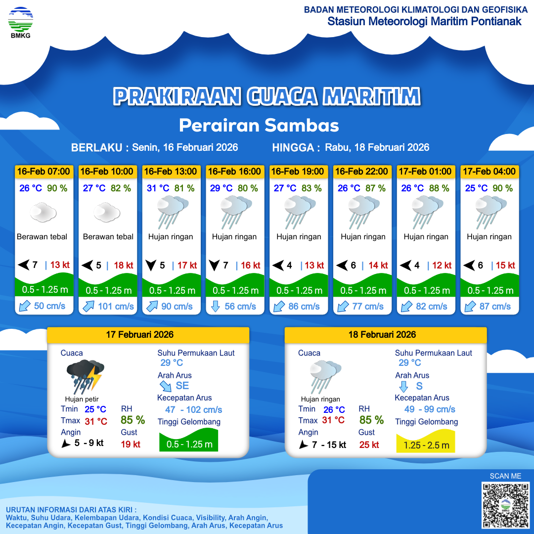 17 Feb 26, 01.00 2 jam kedepan | Timur 5 kt Gust Peningkatan kecepatan angin yang singkat dan tiba-tiba : 16 kt | 1.1 m Rendah | Selatan 57.0 cm/s | 26 °C | 88 % | |