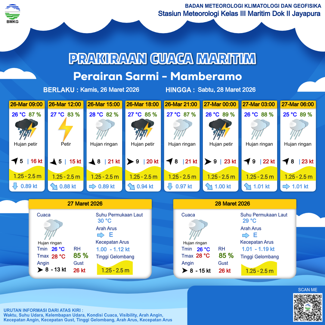 26 Mar 26, 08.00 8 jam kedepan | Barat 9 kt Gust Peningkatan kecepatan angin yang singkat dan tiba-tiba : 20 kt | 1.6 m Sedang | Timur 0.9 Knots | 27 °C | 84 % | |