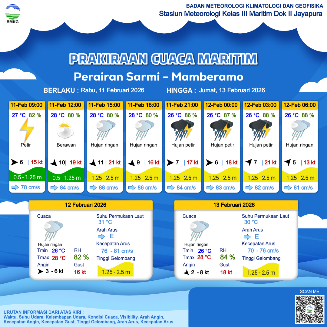11 Feb 26, 18.00 2 jam kedepan | Barat Daya 7 kt Gust Peningkatan kecepatan angin yang singkat dan tiba-tiba : 21 kt | 1.7 m Sedang | Timur 82.0 cm/s | 26 °C | 88 % | |