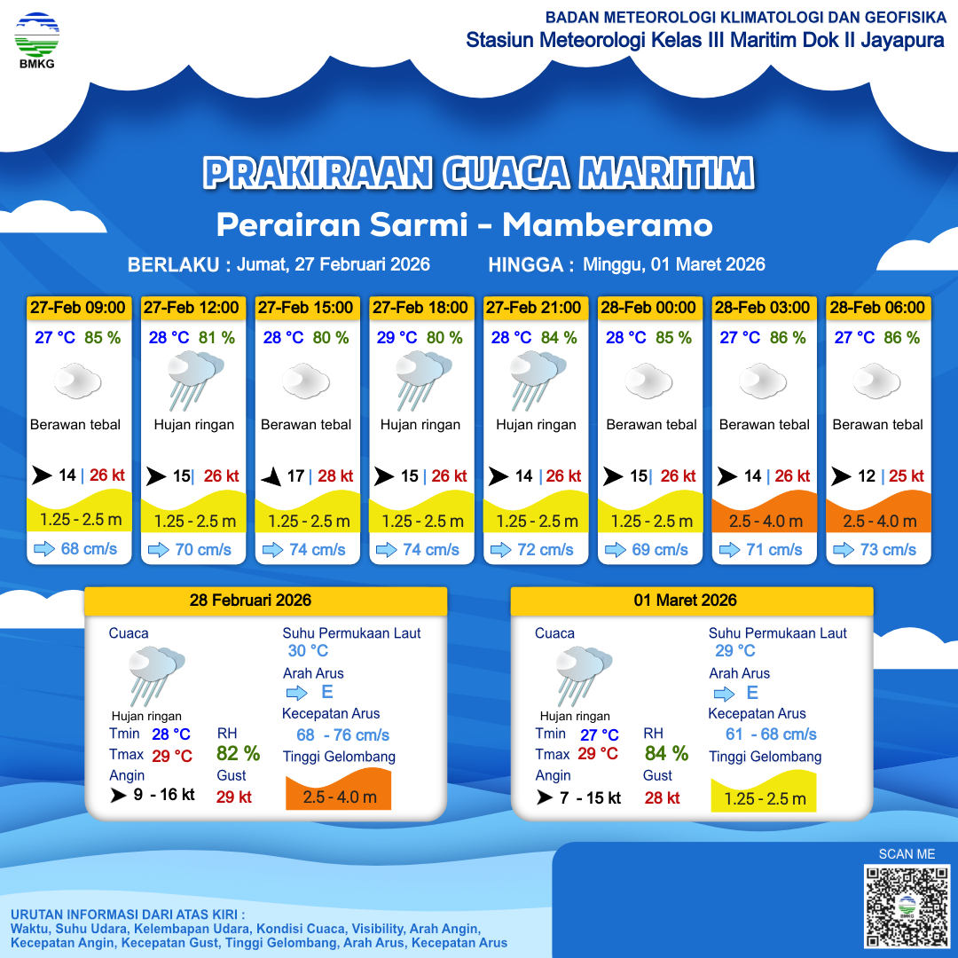 27 Feb 26, 22.00 2 jam kedepan | Berawan Tebal | Barat 12 kt Gust Peningkatan kecepatan angin yang singkat dan tiba-tiba : 23 kt | | | 27 °C | 86 % |