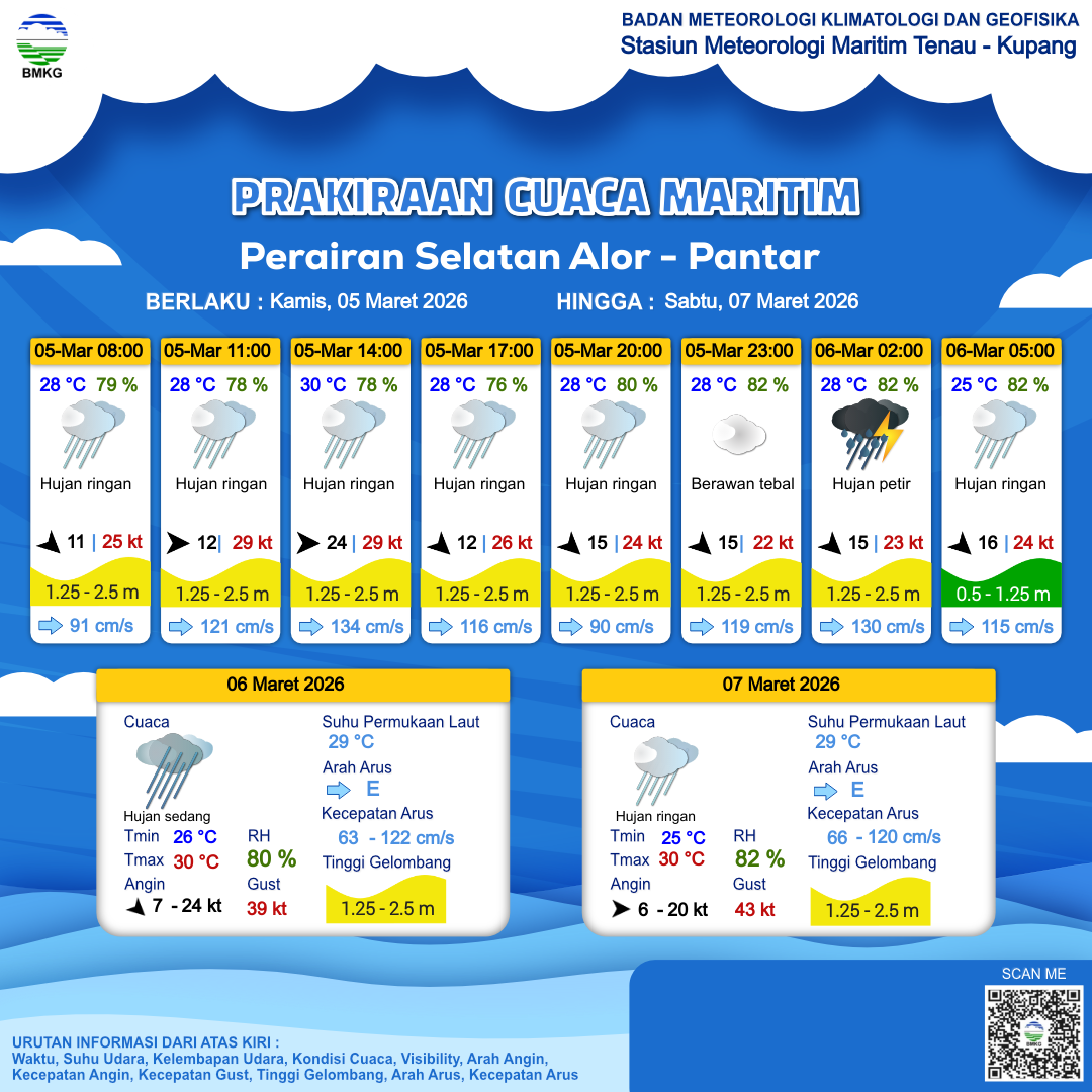 5 Mar 26, 16.00 3 jam kedepan | Barat Laut 15 kt Gust Peningkatan kecepatan angin yang singkat dan tiba-tiba : 22 kt | 1.4 m Sedang | Timur 120.0 cm/s | 28 °C | 82 % | |