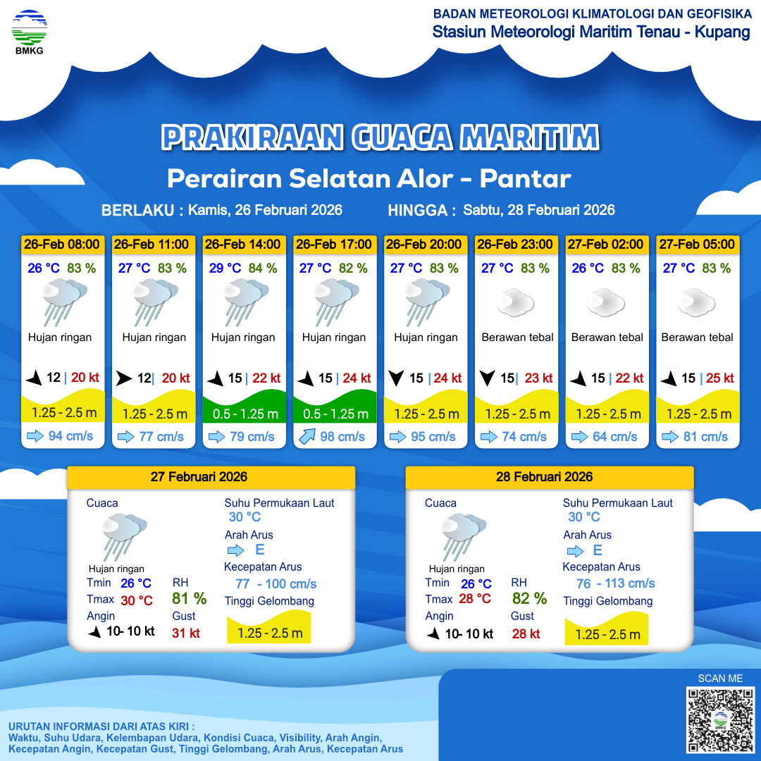 26 Feb 26, 14.00 3 jam kedepan | Utara 15 kt Gust Peningkatan kecepatan angin yang singkat dan tiba-tiba : 23 kt | 1.4 m Sedang | Timur 82.0 cm/s | 27 °C | 83 % | |